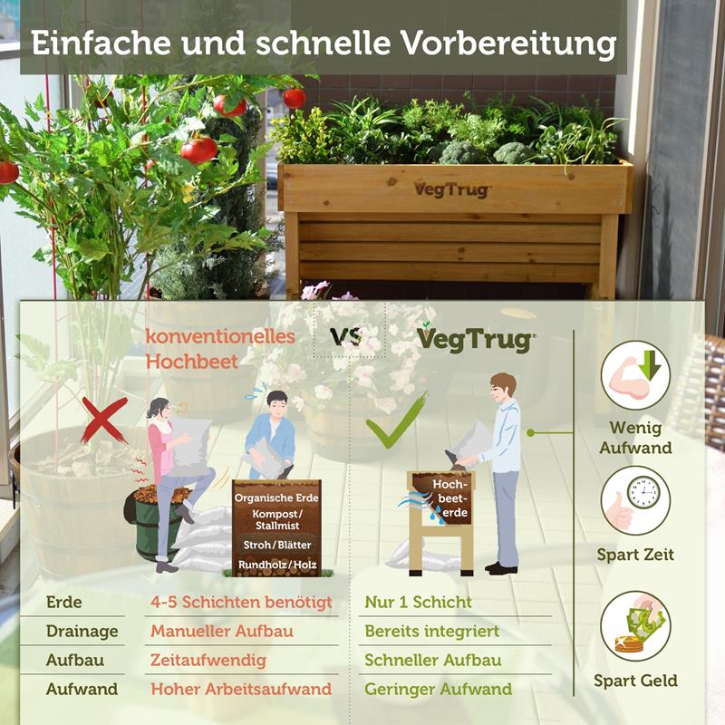 Die auf Ergonomie ausgelegte erhöhte, einzigartige V-Form ermöglicht den gleichzeitigen Anbau von flach und tief wurzelndem Gemüse, und bietet mit einer idealen Arbeitshöhe einfachen Barrierefreien Zugang auch für Rollstuhlfahrer.